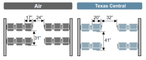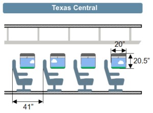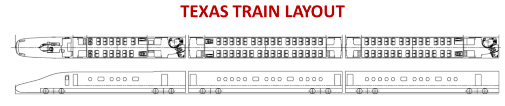 As you can see, Texas High-Speed Train cars feature 2×2 and 2×1 seating only with NO MIDDLE SEAT EVER. This design gives passengers nearly a foot more legroom than most coach airlines seats ensuring the MOST COMFORTABLE ride possible for all riders. So, no more waking up your neighbor just to get up and use the restroom. Other important features include wider aisles, improved lighting, and audio and visual signals for train arrivals and departures.